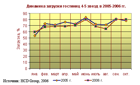 развития рыночных показателей московских отелей верхнего сегмента. Заполняемость большинства гостиниц этой категории в октябре т.г. превысила прошлогодний показатель на 2% (2005 г